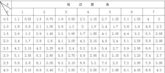 P 弯边圆角换算展开尺寸,见表1